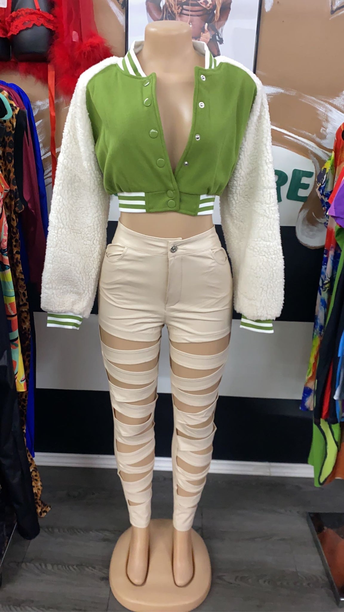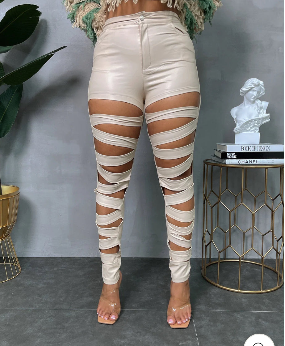 Stretchy leather peek a boo pants